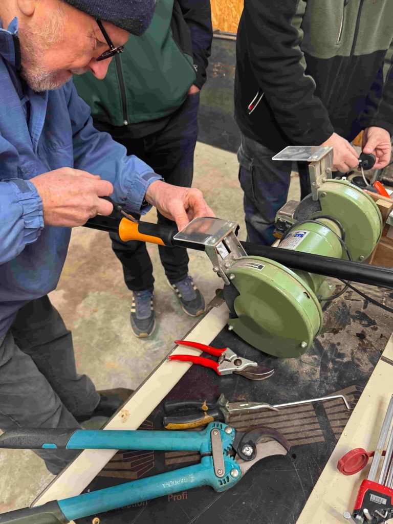 In unserer Schulung vermittelte Klaus Herrmann, 2. Vorstand, sein fundiertes Wissen über die Vor- und Nachteile von Ambos- und Bypass-Scheren sowie deren fachgerechte Pflege – von großen bis hin zu kleinen Modellen sowie die Reparatur von Teleskopscheren. Darüber hinaus wurden verschiedene Methoden zur Messerschärfung vorgestellt und erklärt, wie Werkzeuge mit unterschiedlichen Pflegemitteln richtig gereinigt und instand gehalten werden.