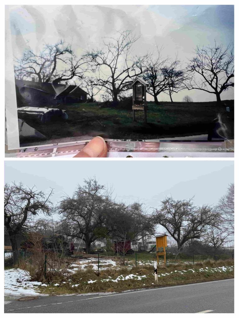 Hans Göding zeigte ein Foto des Grundstücks aus seiner Lehrzeit, wodurch ein anschaulicher Vergleich zwischen früher und heute möglich war. Nach einer ausführlichen Baumansprache begann die Gruppe mit den anstehenden Pflegearbeiten.